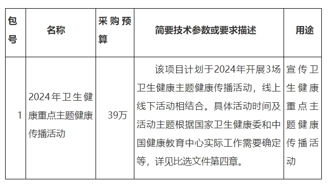 中国健康教育中心就“2024年卫生健康重点主题健康传播活动”进行比选采购,现邀请合格供应商参加比选响应。