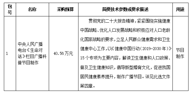中国健康教育中心就 “中央人民广播电台《生命对话》栏目广播科普节目制作”进行比选采购,现邀请合格供应商参加比选响应。