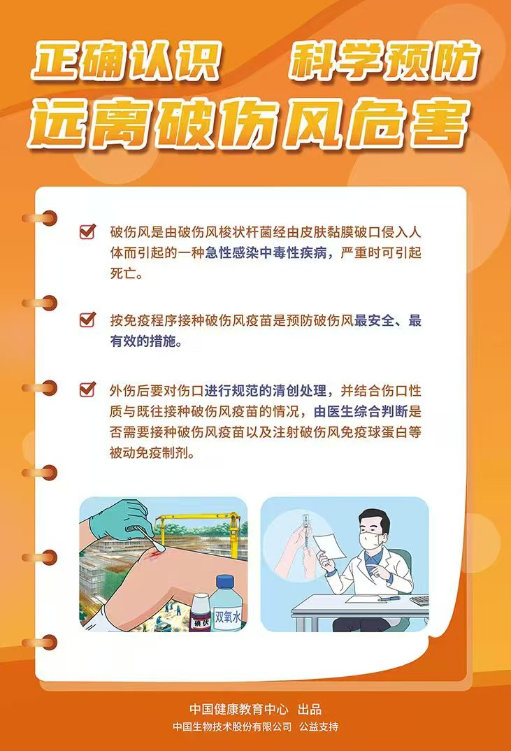 为进一步做好传染病防控健康教育,提升公众的健康素养,倡导健康生活方式,中国健康教育中心将开发预防传染病系列海报,现发布“正确认识 科学预防 远离破伤风危害”主题海报,欢迎传播使用。